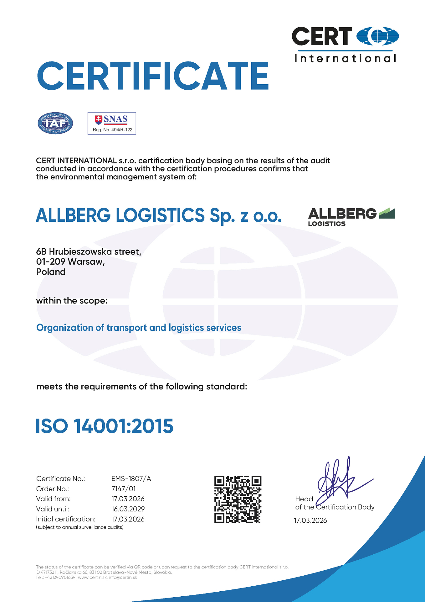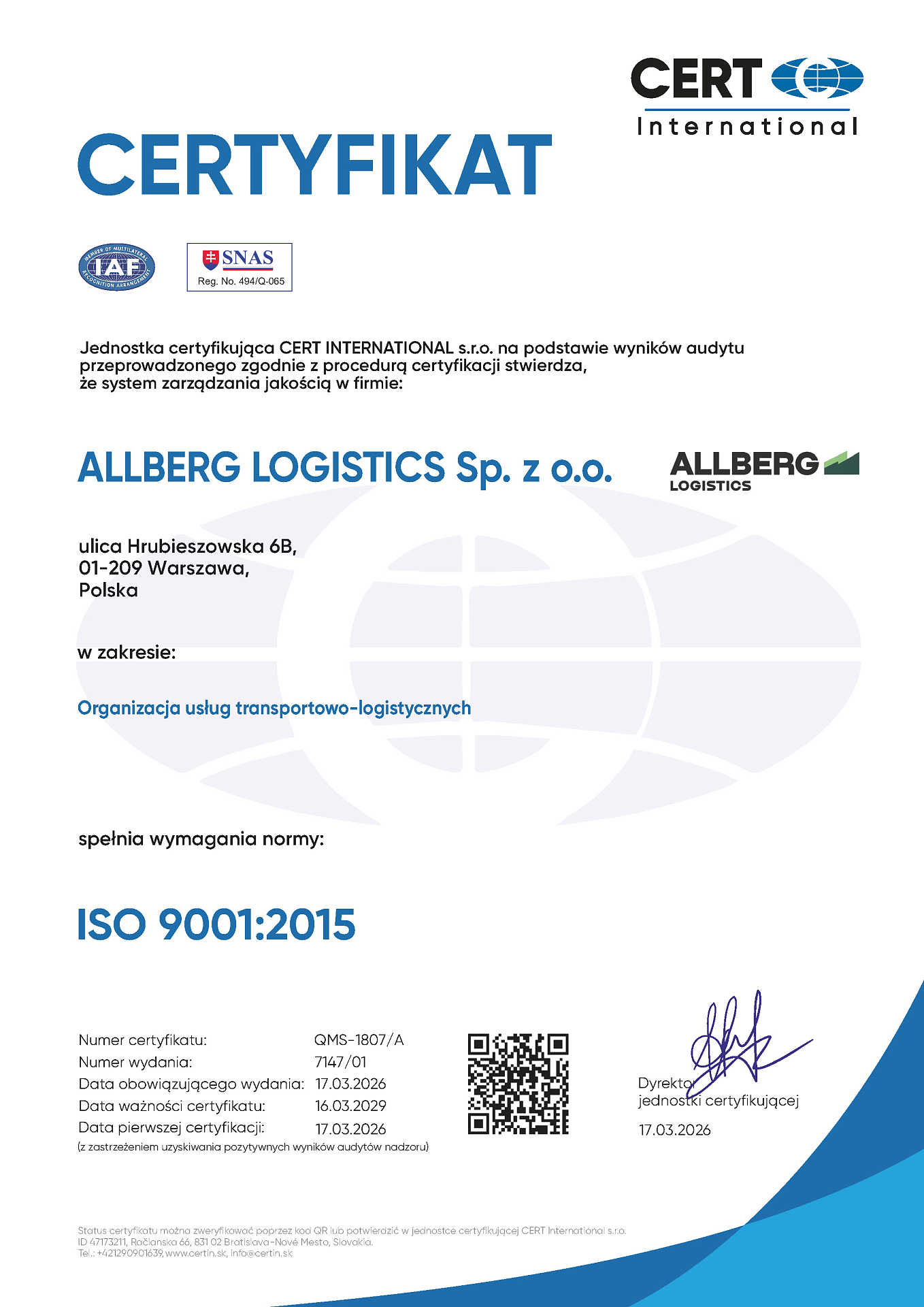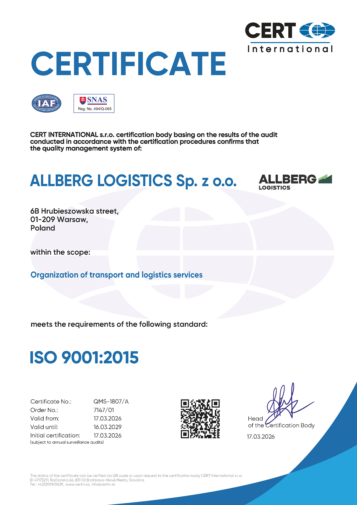 ALBERG LOGISTICS strives to develop and improve the existing management system and make sure it meets the highest quality management standards for international services. The main goal of our quality management system is the ultimate satisfaction of our customers’ needs.